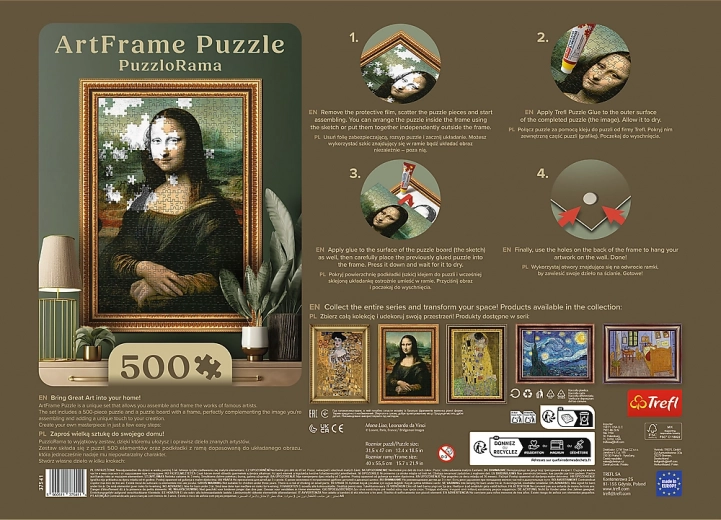 Objavte úplne nový pohľad na skladanie puzzle prostredníctvom série PuzzloRama. Každá sada obsahuje 500 dielikov, ktoré po zložení vytvoria krásnu reprodukciu slávneho majstrovského diela Mona Lisa, zasadenú do elegantného rámu. V balení nájdete všetko potrebné pre relaxačný a zároveň kreatívny zážitok.