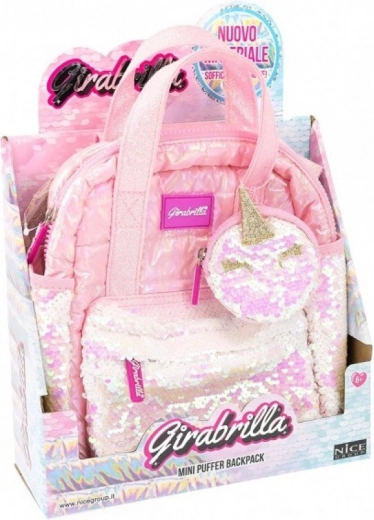 Štýlový ružový mini batoh vyrobený z mäkkej, opalizujúcej tkaniny obsahuje farebné flitrované vrecká a jedinečnú peňaženku v tvare jednorožca.