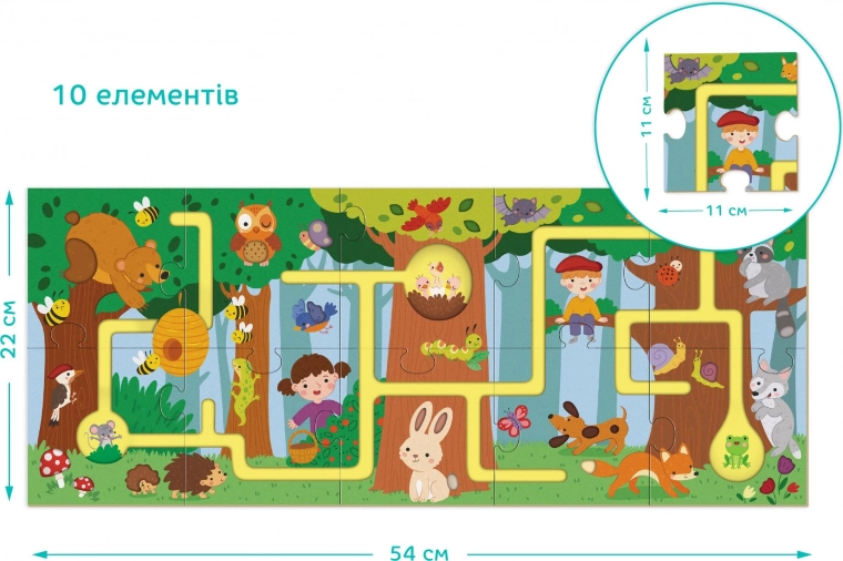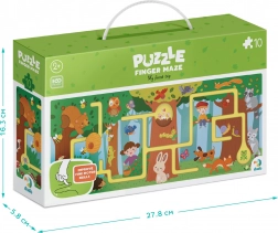 Toto skvelé puzzle prináša hravú formu objavovania lesa, kde deti môžu viesť prstom po drážkach a prechádzať roztomilú trasu plnú veveričiek, zajacov, ježkov a vtáčikov. Ilustrácie dodávajú celému procesu kúzlo a deti sa môžu učiť poznávať lesné zvieratá. Puzzle je navrhnuté tak, aby rozvíjalo jemnú motoriku, koordináciu, pozornosť a predstavivosť malých detí.