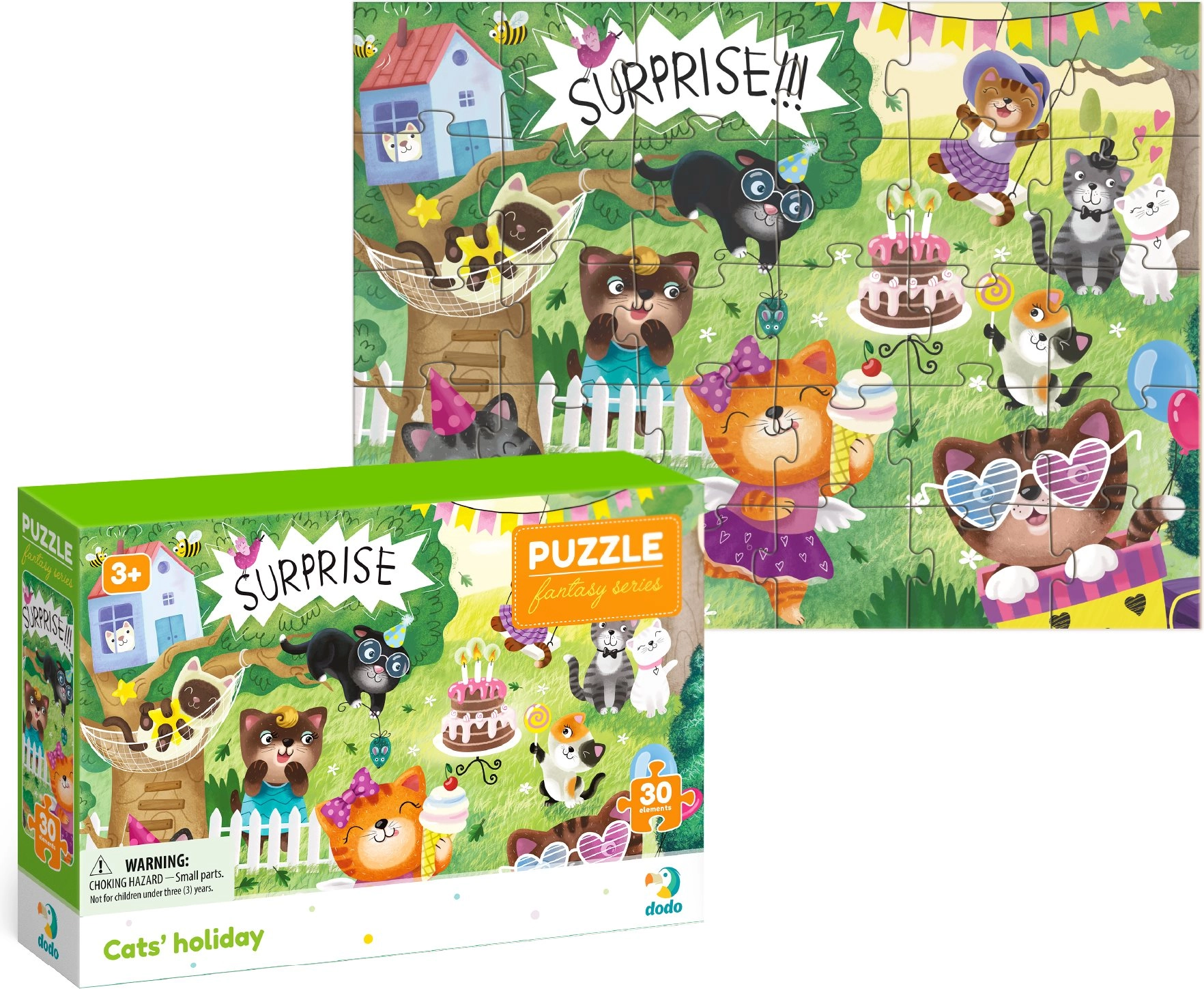 Užite si zábavné skladanie s puzzlom DODO Fantasy: Mačacia dovolenka, ktorý ponúka 30 dielikov s roztomilými motívmi mačiek na dovolenke. Perfektné pre malých aj veľkých milovníkov puzzle.