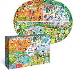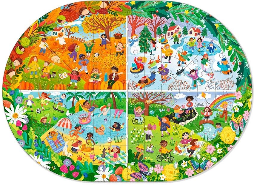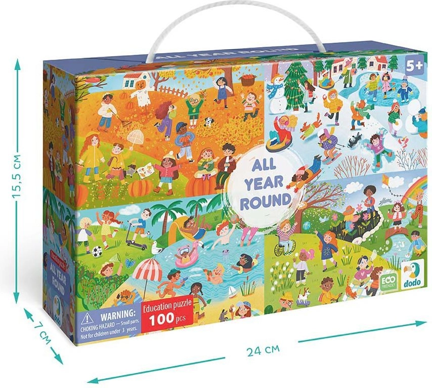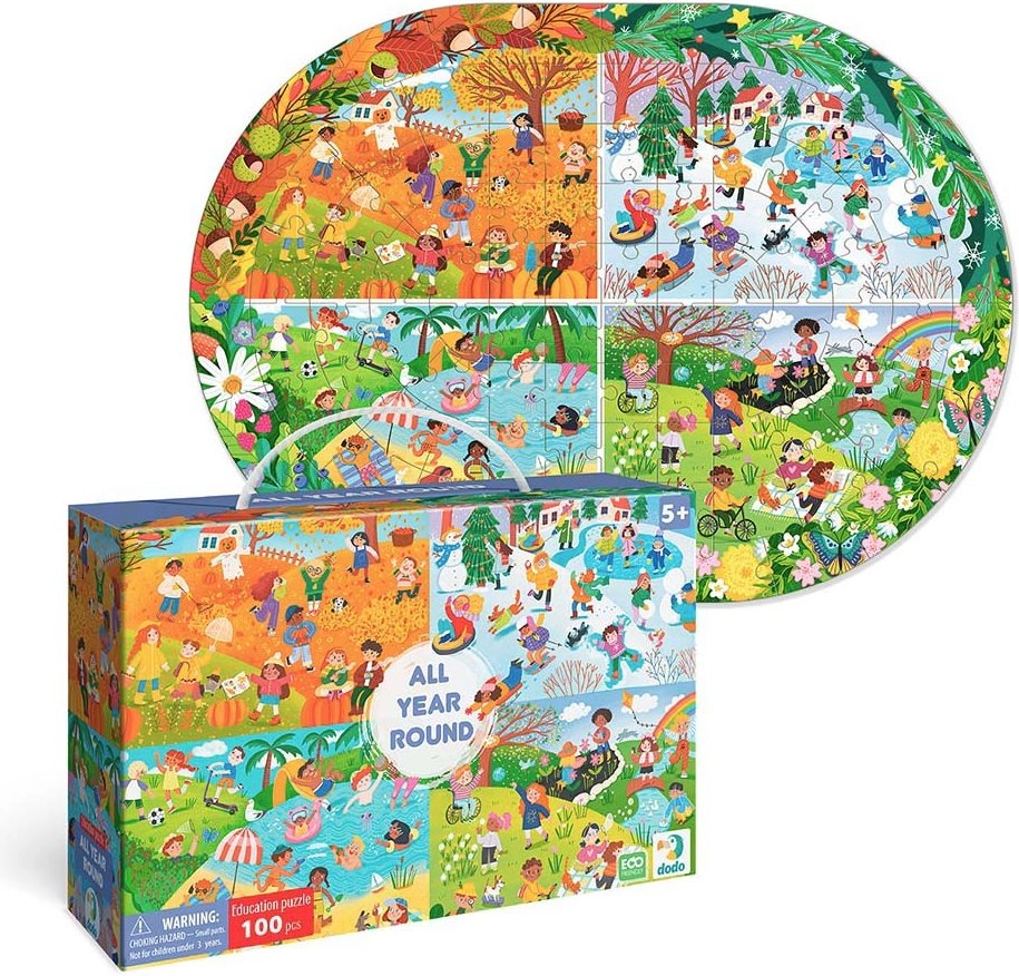 Puzzle DODO – Počas celého roka je ideálnym darčekom pre každého milovníka skladačiek. Toto puzzle obsahuje 100 dielikov, ktoré predstavujú farebný a detailný obrázok jednotlivých ročných období. Zložené puzzle má rozmery 45 x 33 cm, čo je perfektná veľkosť pre zarámovanie a vystavenie.