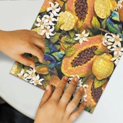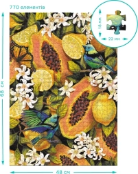 Objavte každý detail tohto krásneho puzzle, kde sa farebné a detailné zobrazenie tropického ovocia stretáva so starostlivo navrhnutými dielikmi, ktoré do seba presne zapadajú. Po dokončení skladania má puzzle približné rozmery 48 x 64 cm.