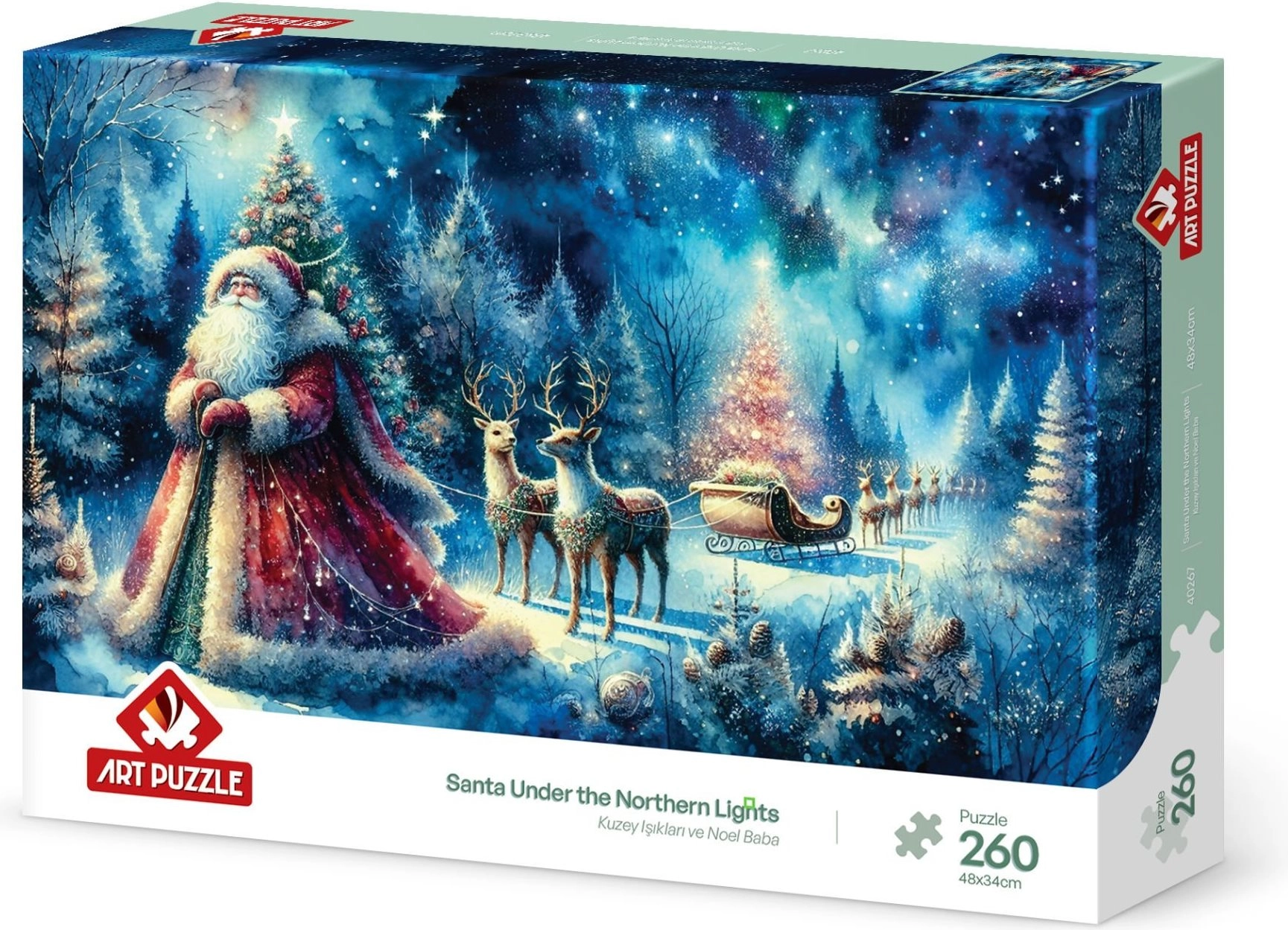 Vychutnajte si vianočnú atmosféru s krásnym Puzzle Santa pod Severnou Oblohou, ktoré obsahuje 260 dielikov. Perfektné pre rodinné chvíle strávené skladaním a pre fanúšikov zimnej tematickej skladačky.