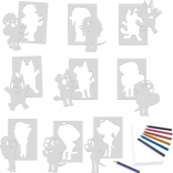 Táto sada obsahuje 9 kartónových panelov s postavičkami, omaľovánky a 6 farebných voskoviek – všetko, čo je potrebné na zábavnú a vzdelávaciu činnosť.