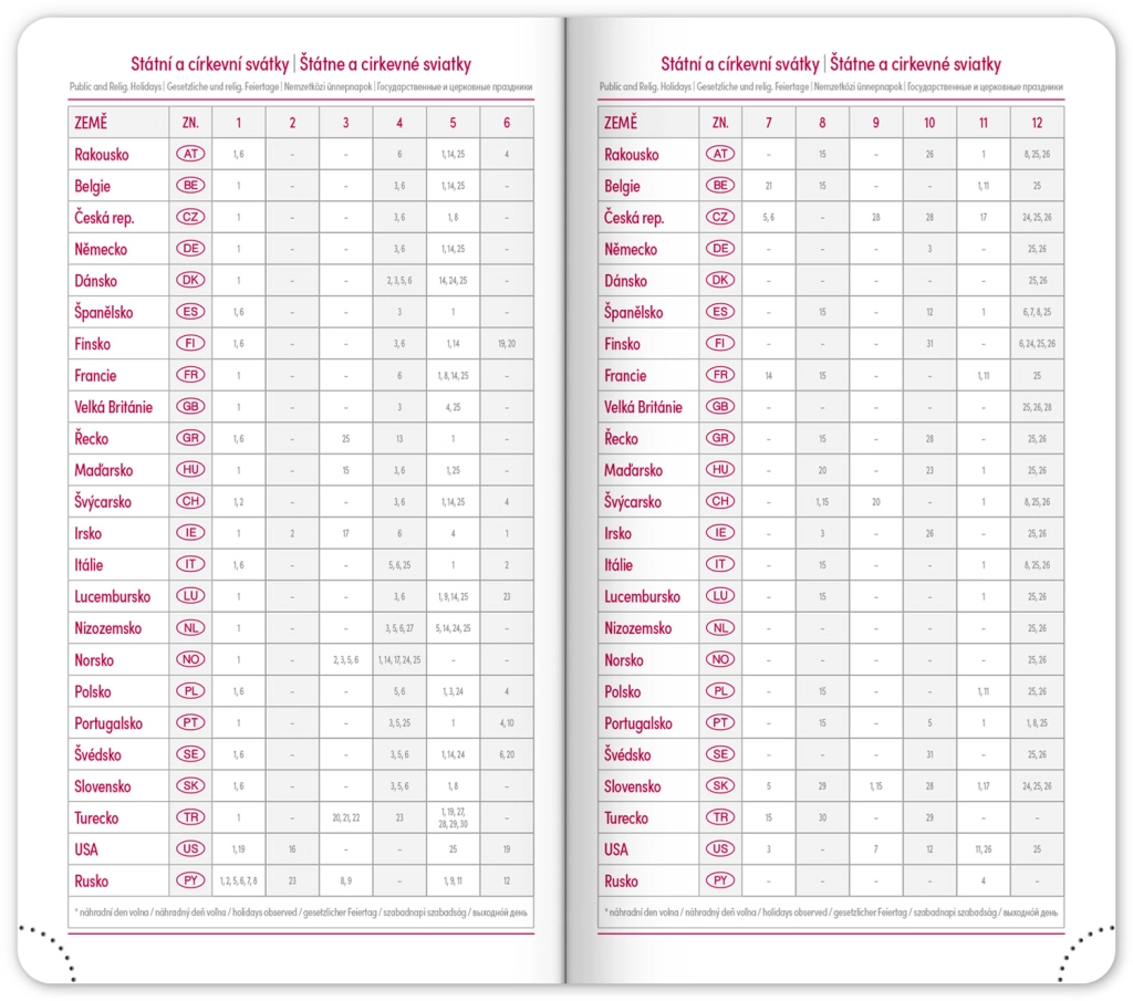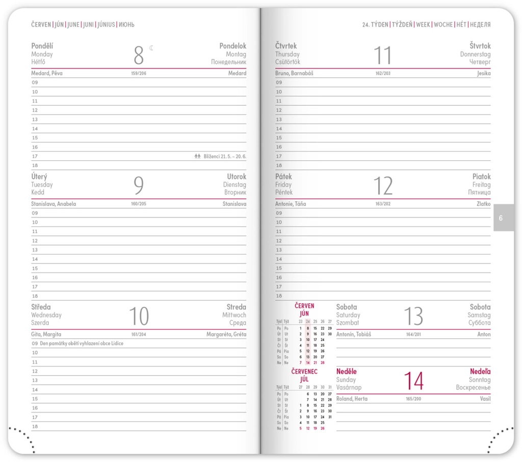 - Týždenný rozvrh s česko-slovenským kalendárom a doplnkovými jazykmi ako angličtina, nemčina, maďarčina a ruština.