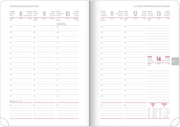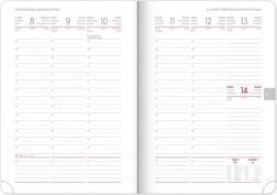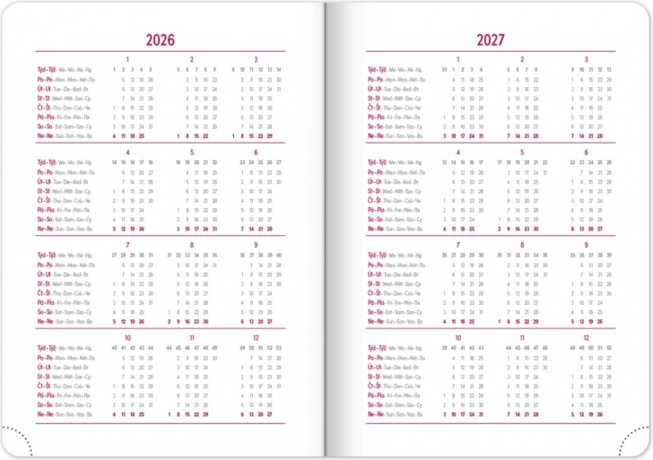 Týždenný diár Ajax 2026 je ideálnym riešením pre tých, ktorí vyžadujú precízne usporiadanie svojich plánov. Obsahuje týždenný rozvrh s česko-slovenským kalendáriom a doplnkové jazyky ako angličtina, nemčina, maďarčina a ruština. Vďaka svojej konštrukcii s elastickou gumičkou a textilnou záložkou je ľahko prenosný a pripravený na každodenné použitie.