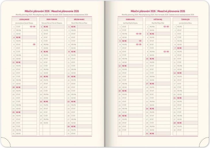 - Mesačné plánovacie kalendáre pre roky 2026 a 2027.