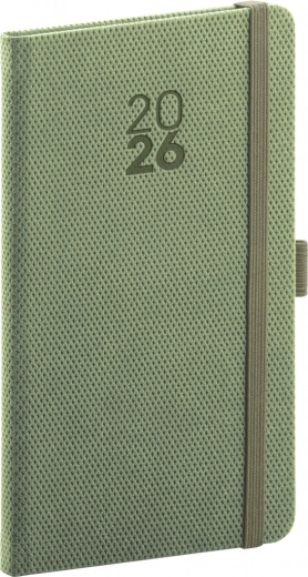 Vreckový diár Diamante 2026 v olivovej farbe je skvelou voľbou pre každého, kto hľadá praktický a štýlový diár s jemným povrchom pripomínajúcim výbrus diamantu. Je ideálny pre rôzne typy razieb a ponúka pohodlie vďaka zaobleným rohom, pútku na pero a elastickej gumičke.