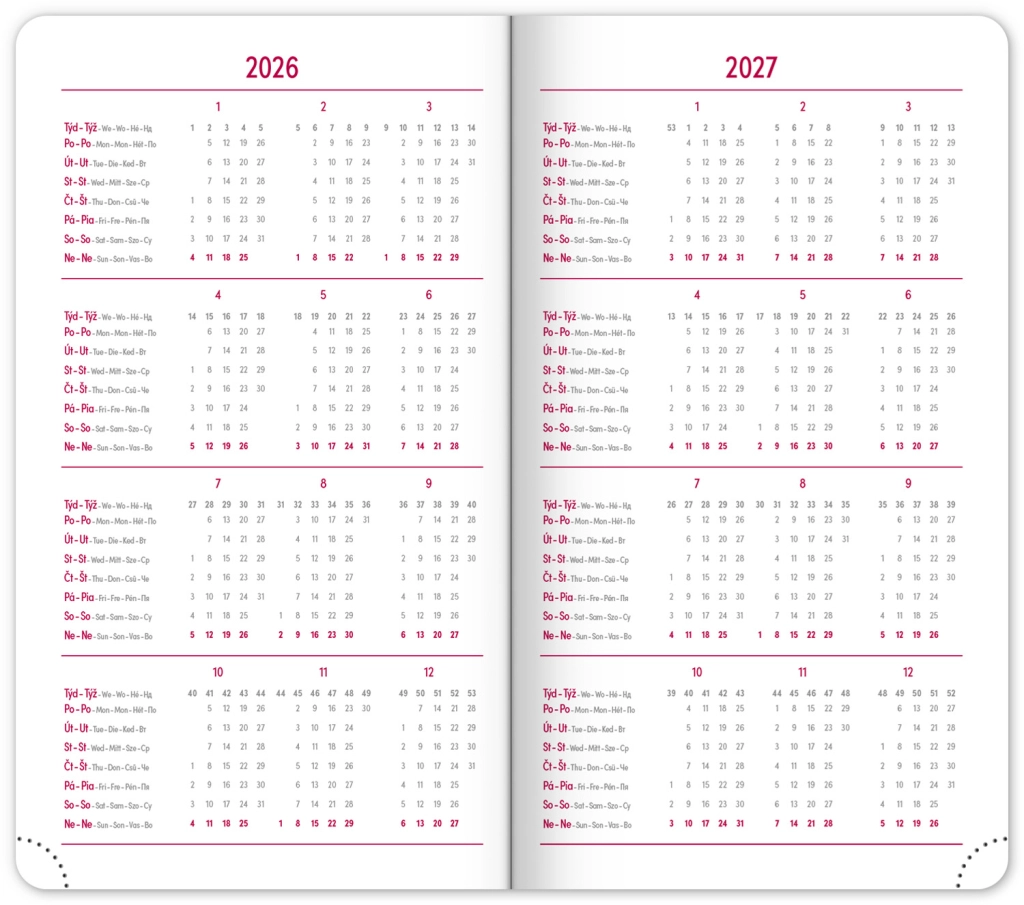 Diár je vybavený týždenným rozvrhom so slovensko-českým kalendárom, doplneným o anglický, nemecký, maďarský a ruský jazyk, čo uľahčuje medzinárodné plánovanie. Užitočné funkcie zahŕňajú: