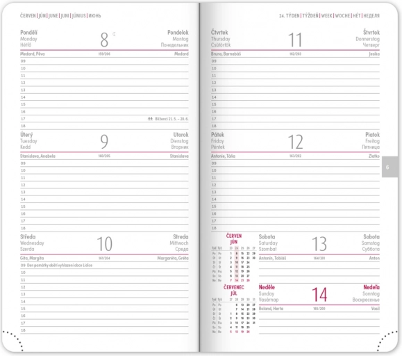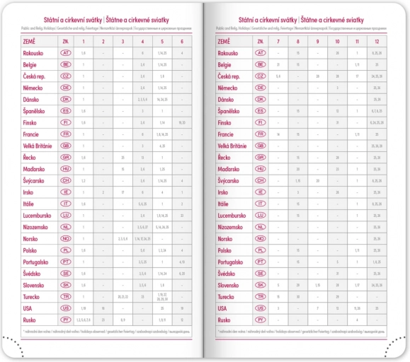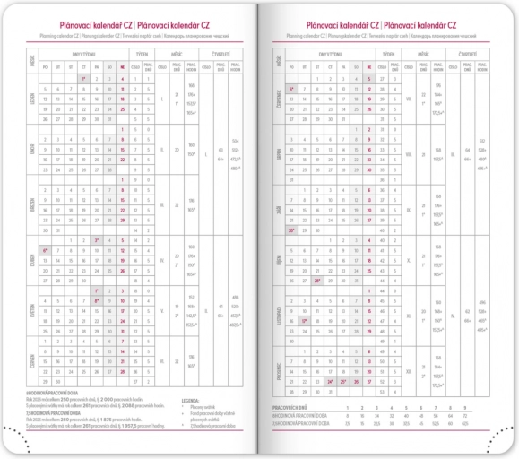- Obsahuje pracovný plánovací kalendár a zoznam slovenských a českých sviatkov.