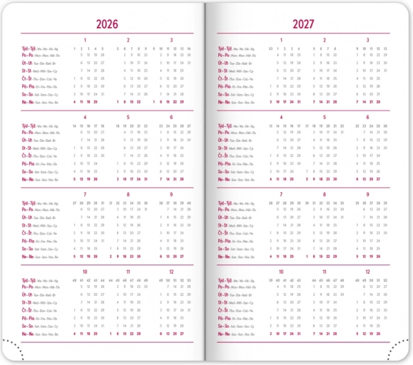 Diár Tomy 2026 ponúka týždenný rozvrh so slovensko-českým kalendárom a doplňkovou angličtinou, nemčinou, maďarčinou a ruštinou. Je skvelý pre medzinárodných užívateľov.