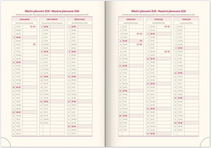 - Týždenné rozloženie s česko-slovenským kalendárom a doplnkovými jazykmi: angličtina, nemčina, maďarčina a ruština.