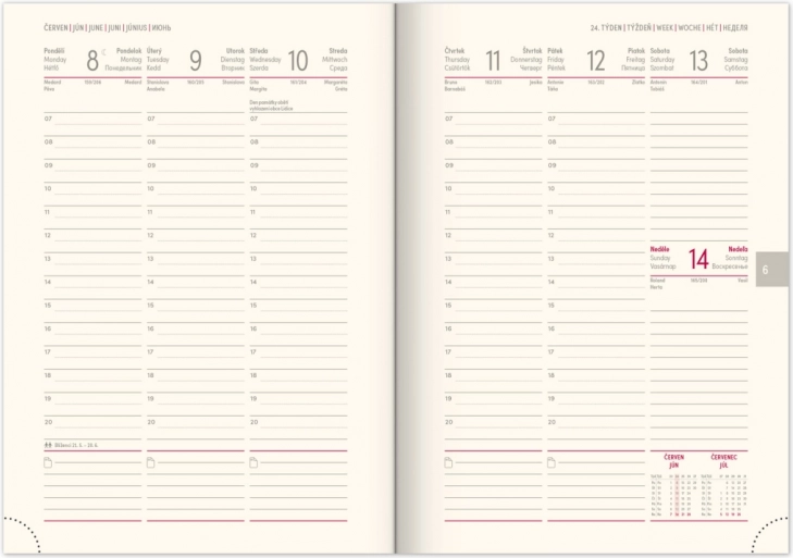 Diár je nielen praktický, ale vďaka červenej farbe aj štýlový a neprehliadnuteľný. Je pripravený pomôcť vám zorganizovať vaše úlohy a dôležité schôdzky v niekoľkých jazykoch - vrátane angličtiny, nemčiny, maďarčiny a ruštiny.