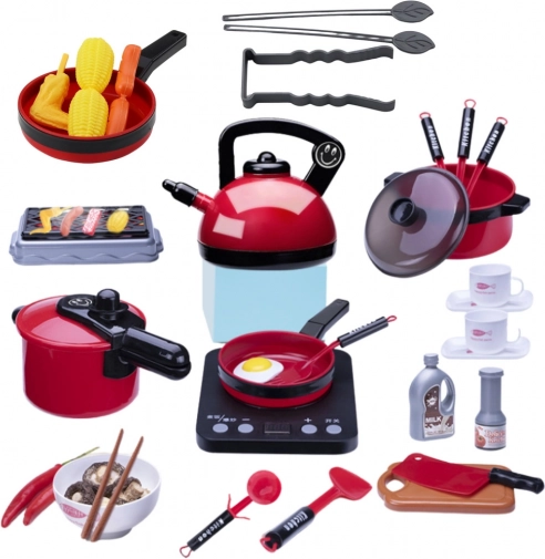 Vďaka tejto sade deti rozvinú svoju predstavivosť, naučia sa základy varenia a zlepšia si organizačné schopnosti. Spoločne s rodičmi či kamarátmi môžu pripravovať imaginárne pokrmy a užívať si tak spoločné chvíle. Prekvapí svojou pestrou červenou a čiernou farebnosťou a detailným spracovaním, vďaka ktorému je ideálna ako darček pre každého malého kuchára.