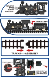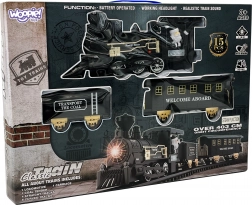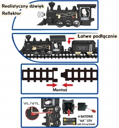 • Kompletný set: lokomotíva so svetlom a zvukmi, uhoľný vozeň, osobný vagón, 8 zakrivených a 4 rovné koľaje
