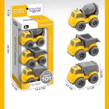 Set troch vozidiel WOOPIE prenesie deti priamo na stavenisko. Každé auto má pohyblivé časti pre autentické scenáre – miešačka roztáča bubon, sklápačka vyklápa korbu a smetiarske auto umožňuje nakládku odpadu. Vďaka frikčnému pohonu stačí vozidlo postrčiť a samo sa rozbehne, čo podporuje aktívnu hru bez batérií.