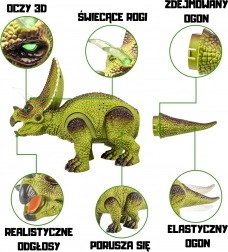 - Dinosaurus sa pohybuje dopredu a dozadu, napodobňujúc chôdzu skutočného Triceratopsa