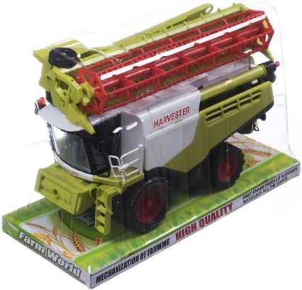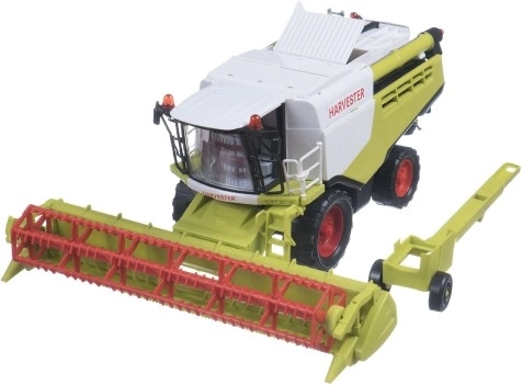 Detailne prepracovaný kombajn v šedo-zelenom farebnom prevedení s veľkou prednou radlicou. Tento model je vernou kópiou skutočnej poľnohospodárskej techniky.