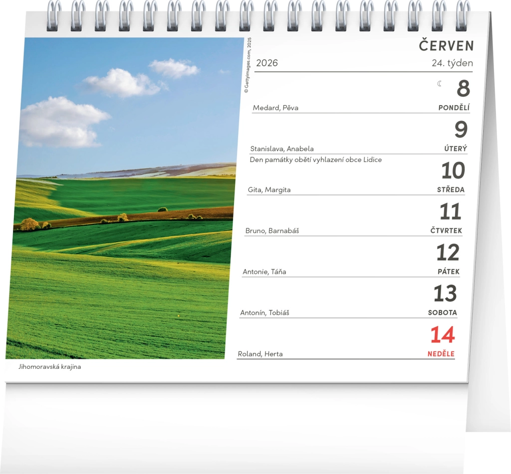Objavte krásu Čiech, Moravy a Sliezska s naším stolovým kalendárom na rok 2026. Obsahuje sviatky, pamätné dni a mesačné fázy.