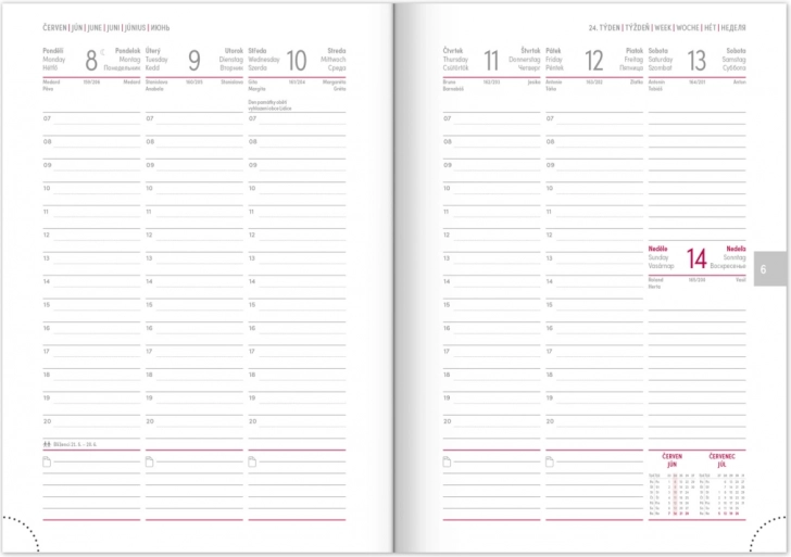 - Týždenný rozvrh s česko-slovenským kalendárom a doplnkovými verziami v angličtine, nemčine, maďarčine a ruštine.