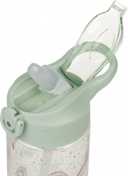Fľaša s integrovanou slamkou a vyklápacím pítkom, ideálna pre jednoduché a pohodlné pitie.