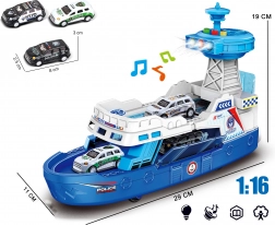 Loď je vyrobená z kvalitných, odolných materiálov, má frikčný pohon (po postrčení ide) a bohaté detaily, vrátane otváracích palúb, zadnej rampy a bočných dverí. Súčasťou setu sú 3 kovové policajné autíčka, ktoré možno nakladať cez rampu a vytvárať napínavé scénky. Upozornenie: loď nepláva – je určená na hru na súši.