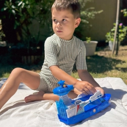 Loď stačí postrčiť a vyrazí vpred vďaka frikčnému mechanizmu. Ideálne na hru na koberci či podlahe. Hračka nepláva.