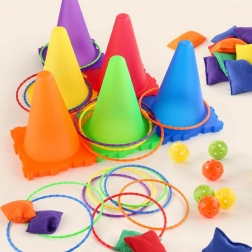 Hod loptičiek do otvorov kužeľov, hod mäkkými vrecúškami na cieľ a hádzanie krúžkov na kužele – kombinujte disciplíny a tvorte vlastné pravidlá pre každú príležitosť.