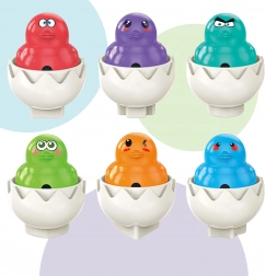 Hračie vajíčka od značky Woopie uvádzajú vaše dieťa do sveta plného farieb, tvarov a veselých tvárí. Každé z šiestich roztomilých vajíčok skrýva farebné kuriatko so smiešnym výrazom a pri stlačení vydáva zvukový efekt. Cieľom je nielen poskladať správnu škrupinku, ale tiež ju umiestniť na správne miesto v zásobníku.