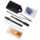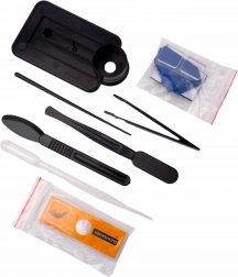 - Sada obsahuje: nástroje pre prípravu vzoriek, základné sklíčka, fľaštičky pre uchovávanie vzoriek, čistiaci obrúsok a držiak na telefón.