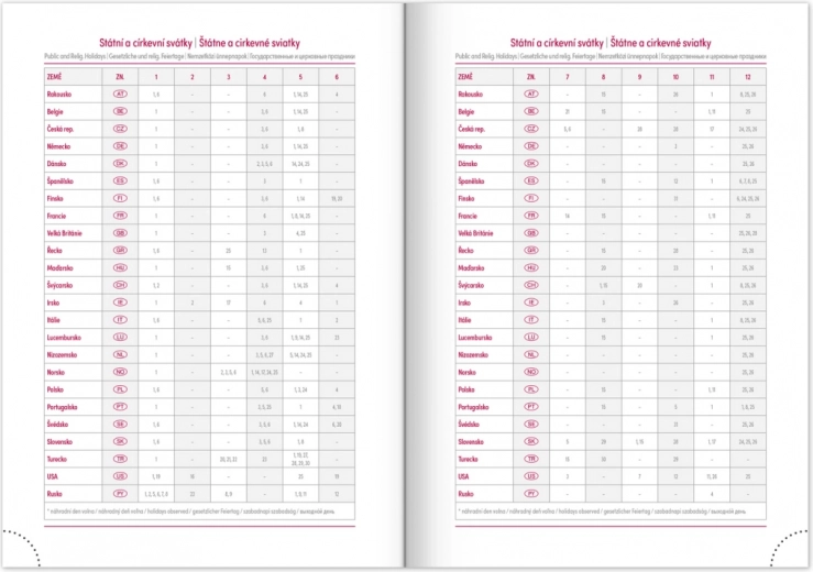- Obsahuje sviatky Českej a Slovenskej republiky a medzinárodné sviatky