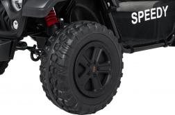 Rodičia ocenia diaľkové ovládanie 2,4 GHz s tromi rýchlosťami a bezpečnostným tlačidlom Stop. Praktický zadný box 49 × 10 × 16 cm pojme drobnosti na výlet. Indikátor nabitia batérie stráži energiu dvoch akumulátorov 12 V 10 Ah zapojených do série (24 V).