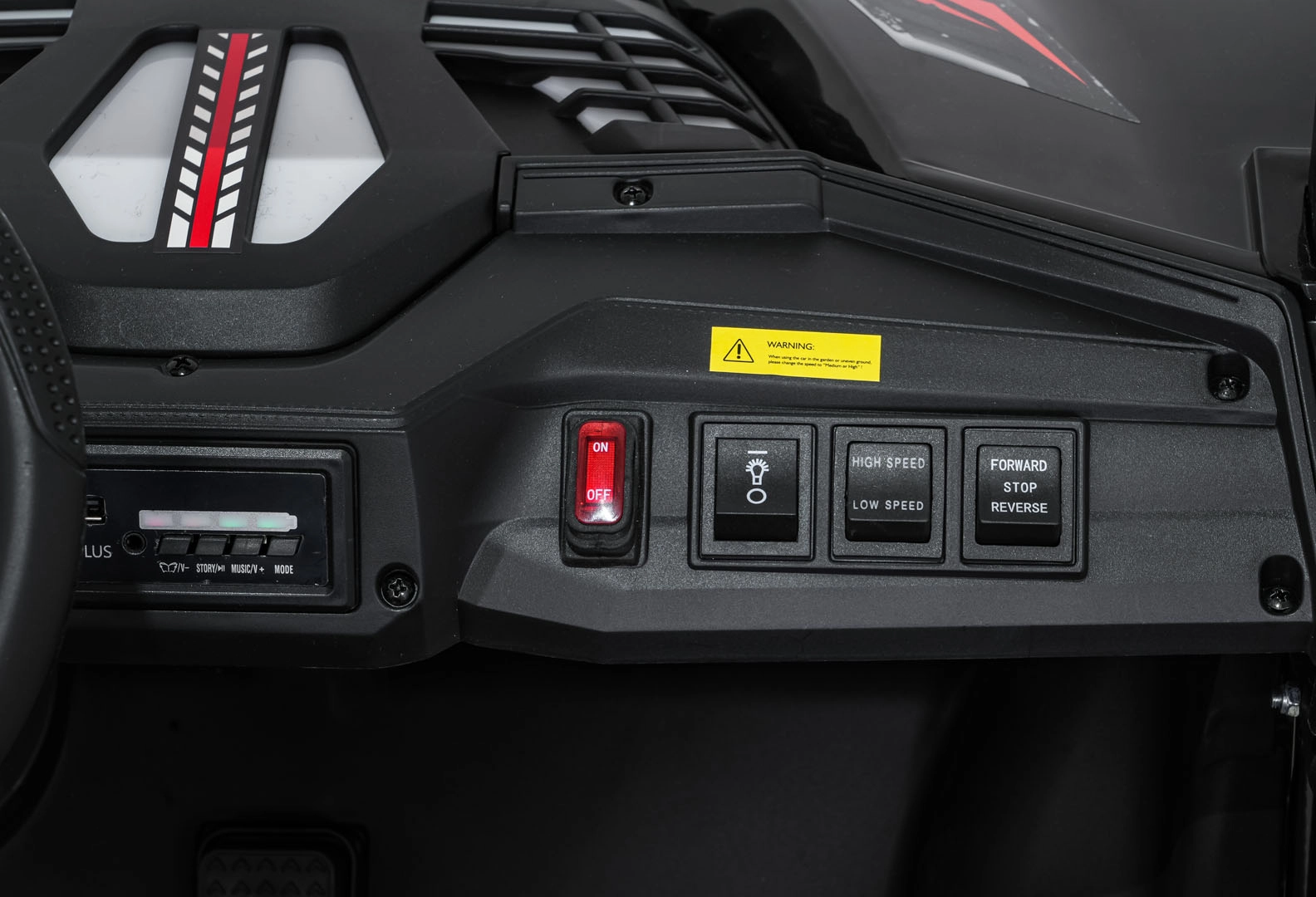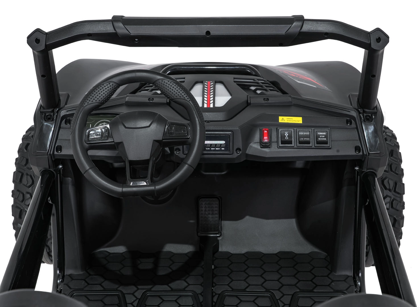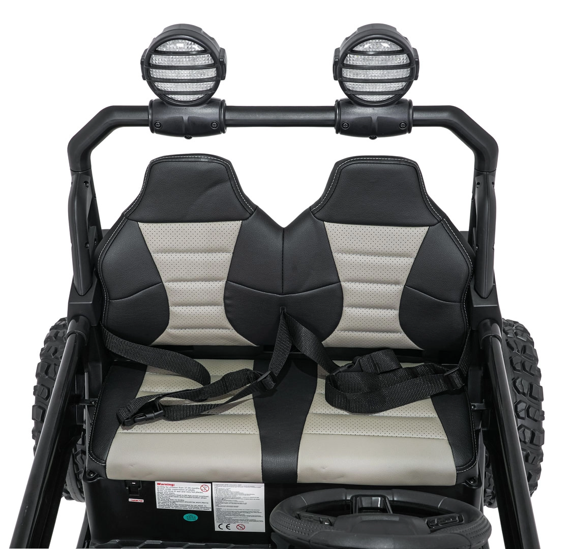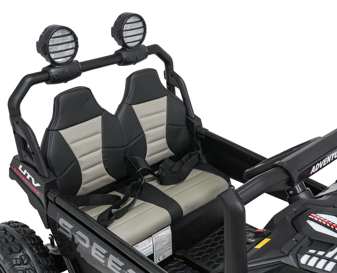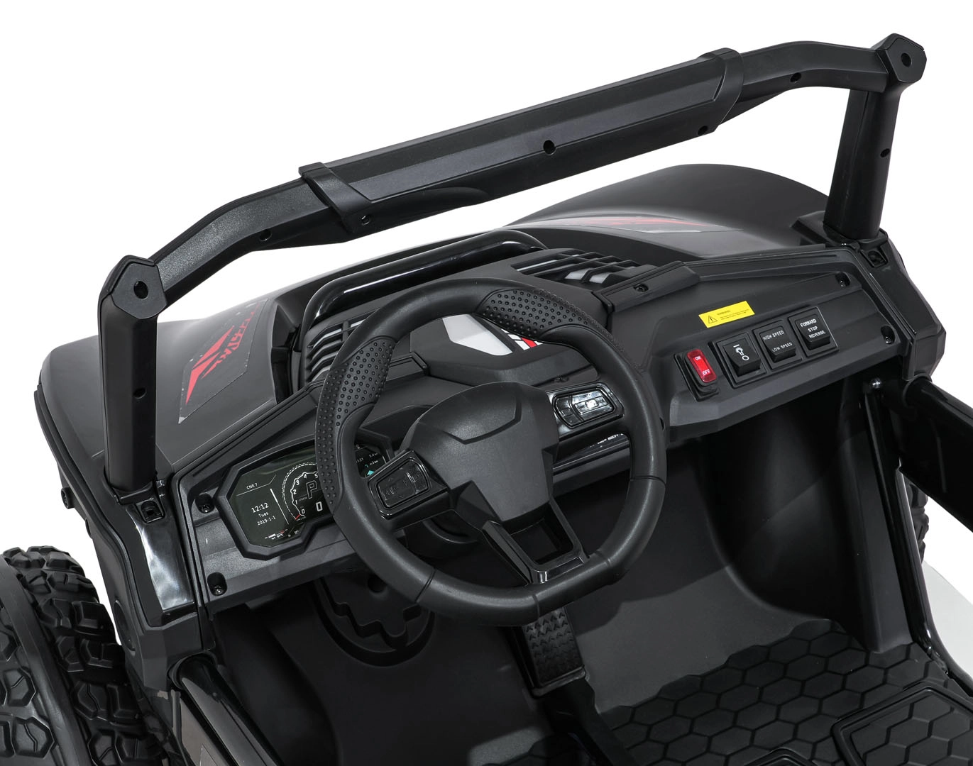 Diaľkový ovládač 2,4 GHz s 3 rýchlosťami a tlačidlom Stop umožní rodičom mať jazdu plne pod kontrolou. Dvojité sedadlo s bezpečnostnými pásmi drží deti pevne a bezpečne.