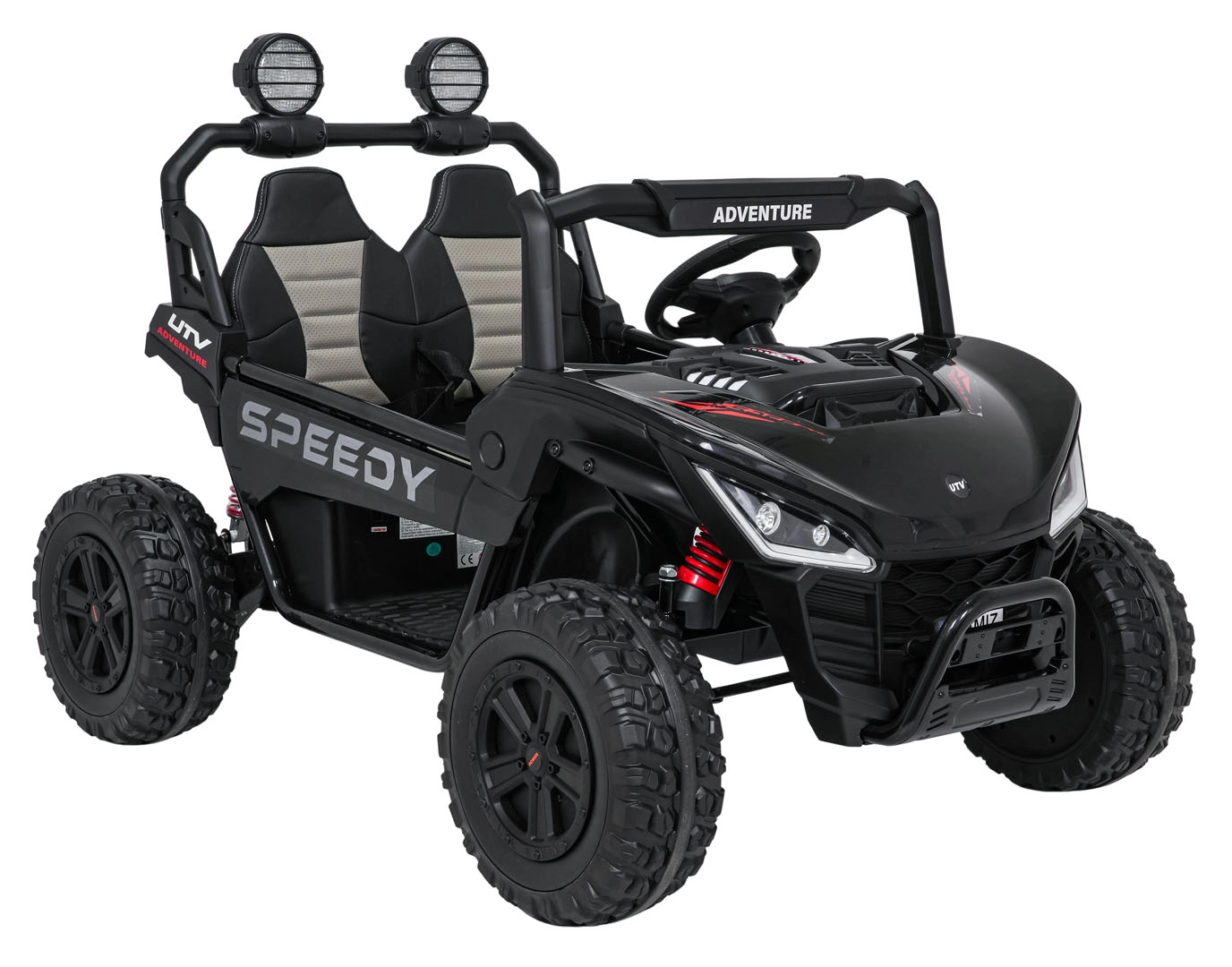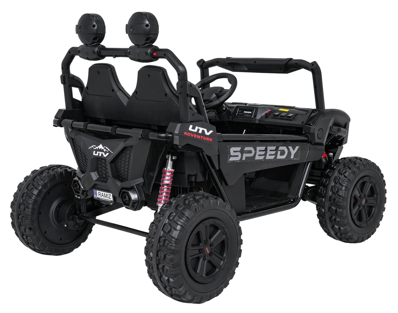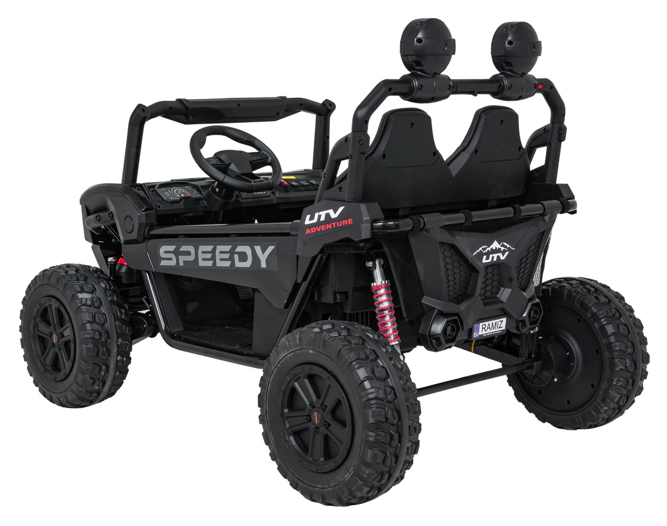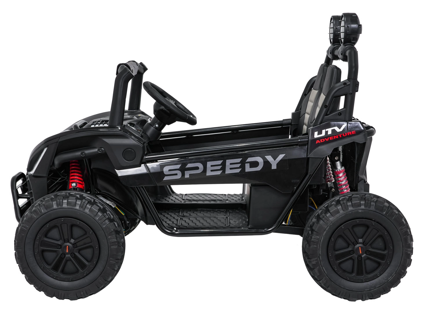 Hľadáte odolné a bezpečné detské vozidlo, ktoré zvládne aj náročnejší terén? Táto buggy SPEEDY 4x4 vyniká kombináciou výkonu a komfortu: štyri motory 200 W (spolu 800 W) v sérii 24 V, veľké penové kolesá EVA 31×12 cm, vysoký svetelný profil 19 cm a zadné nastaviteľné tlmiče pre plynulú jazdu. Dve sedadlá s bezpečnostnými pásmi posadia súrodenca aj kamaráta.