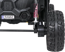 Veľké EVA kolesá 31×12 cm nehučia, skvele tlmia nerovnosti a neprepichnú sa. Zadné nastaviteľné tlmiče zvyšujú stabilitu a pohodlie na nespevnených cestách.