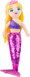 Plyšová morská panna má dlhé, žlté kučeravé vlasy a ružovú korunu. Fialový trblietavý top dotvára estetickú a rozprávkovú postavu, ktorá je ideálna nielen ako hračka, ale aj ako dekorácia do detskej izby.