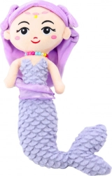 Morská panna má elegantne vyšívanú tvár a drobné zlaté a ružové akcenty na čele s usmievavými očkami. Svetlofialové vlasy sú ozdobené látkovou čelenkou s mašľami po stranách a na krku je farebný náhrdelník z korálok. Celý dizajn pôsobí jemne a rozprávkovo.