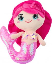 Plyšová morská panna je vybavená veľkými, vyšívanými očami, usmiatou tvárou a ružovými vlasmi ozdobenými mašľou. Jej efektný chvost s trblietkami sa mení z lesklých na matné, čo deťom prináša radosť a podporuje ich hmatový zmysel a predstavivosť.