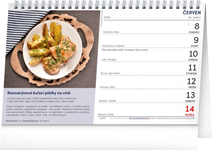 Objavte inšpiráciu pre vašu domácu kuchyňu s týmto stolovým kalendárom plným 53 tradičných receptov, ktoré ctia naše babičky. Kalendár obsahuje české mená, sviatky, pamätné dni a mesačné fázy.