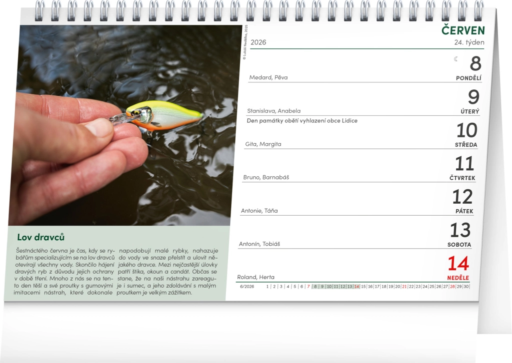Kalendár je vybavený praktickým týždenným rozvrhom s miestom pre osobné poznámky. Ďalšou výhodou je slovenské kalendárium doplnené o fázy mesiaca a rozšírený zoznam krstných mien pre lepšie plánovanie vašich rybárskych výprav.