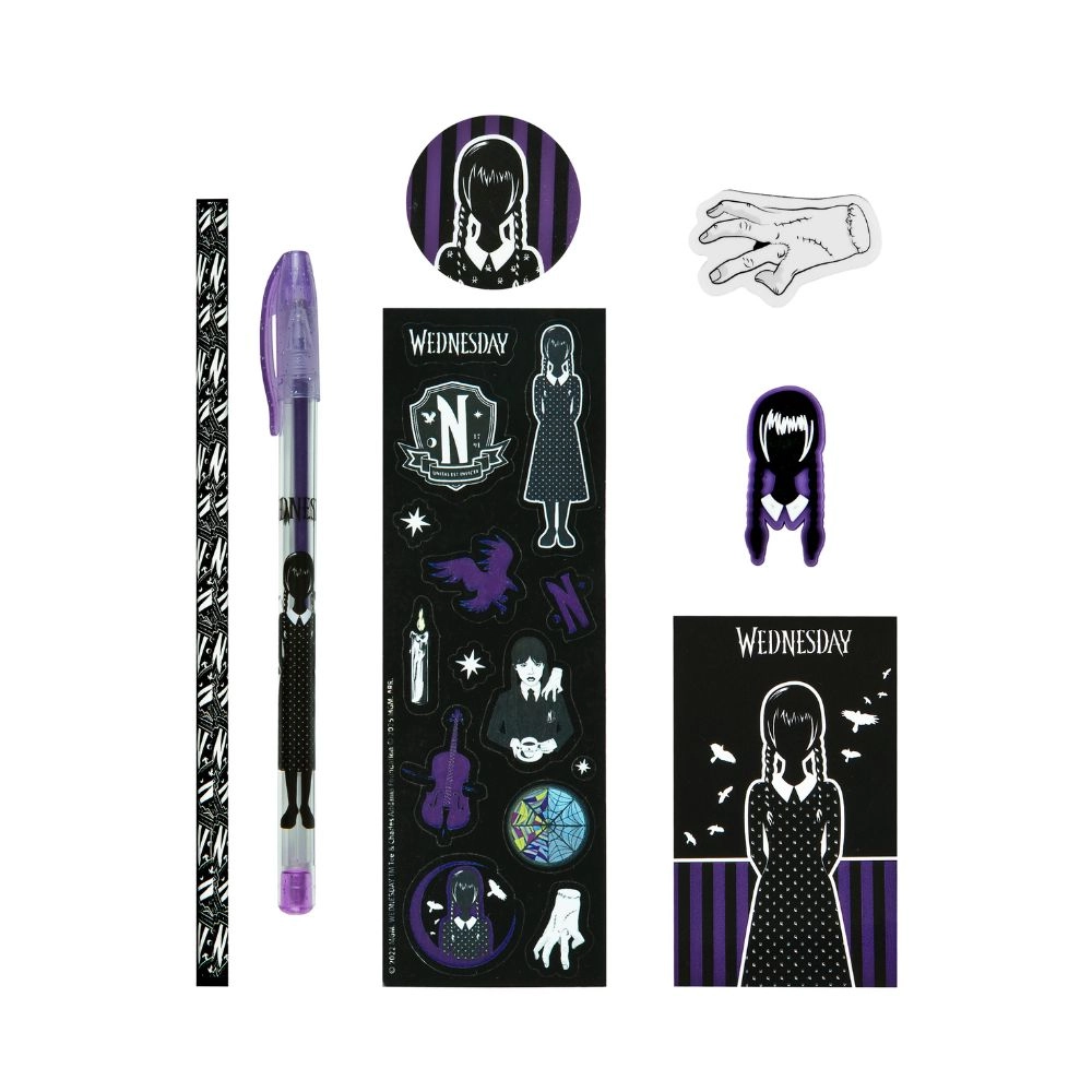 Kreatívny darčekový set s motívom Wednesday obsahuje všetko, čo potrebujete pre písanie a tvorenie. Perfektný darček pre fanúšikov tejto kultovej postavy.
