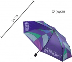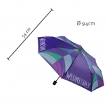 Štýlový skladací dáždnik s temne elegantným motívom Wednesday je ideálny do batoha i kabelky. Kompaktné prevedenie umožňuje ľahké prepravovanie a spoľahlivú ochranu pred dažďom.