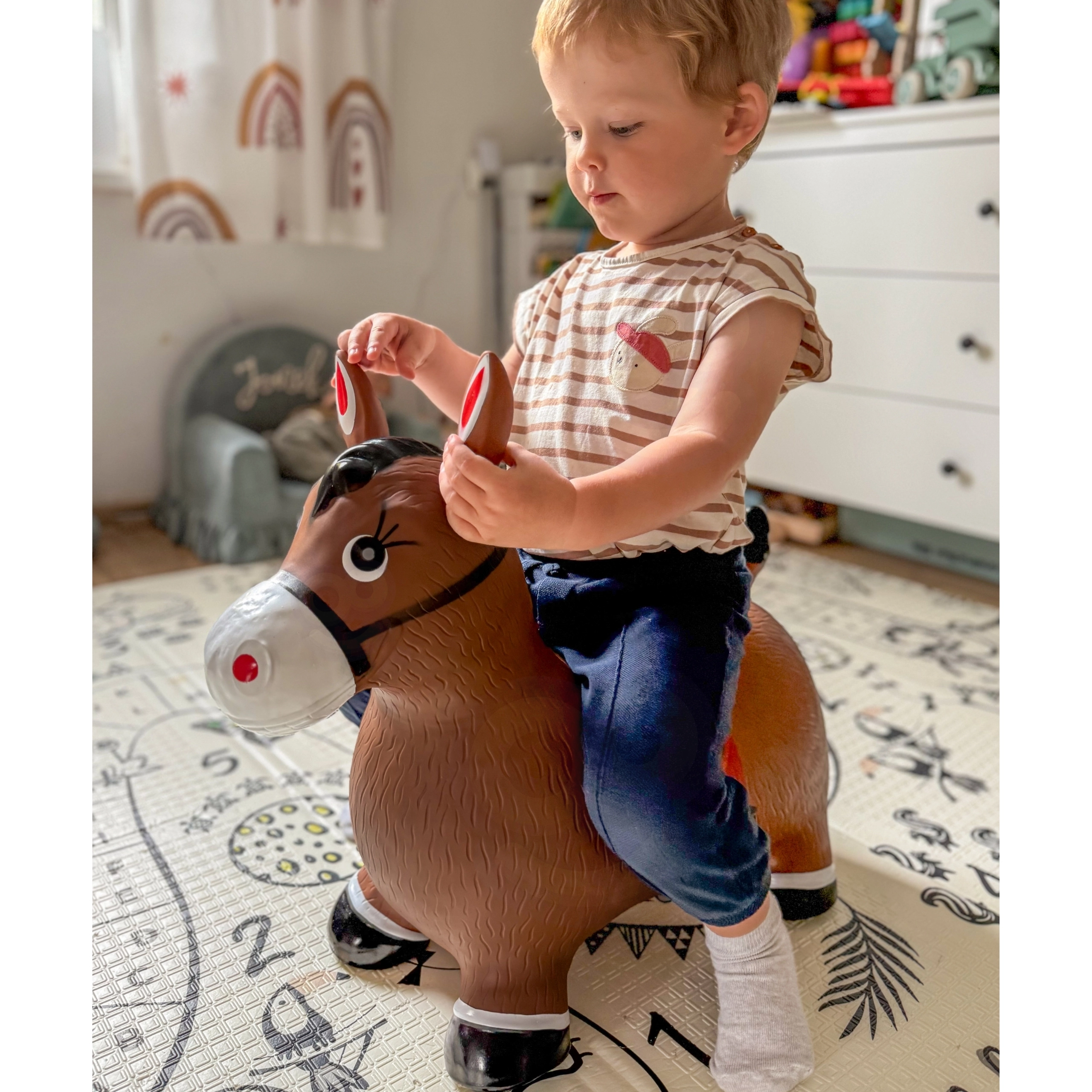 Veselý dizajn roztomilého hnedého koníka so sedlom motivuje k hre a podporuje fantáziu. Maximálna nosnosť je 45 kg a odporúčané plniace tlaky 0,3–0,4 bar zaistia správnu pružnosť pre pohodlné skákanie. Balenie obsahuje praktickú pumpičku, takže hneď po rozbalení môže zábava začať.