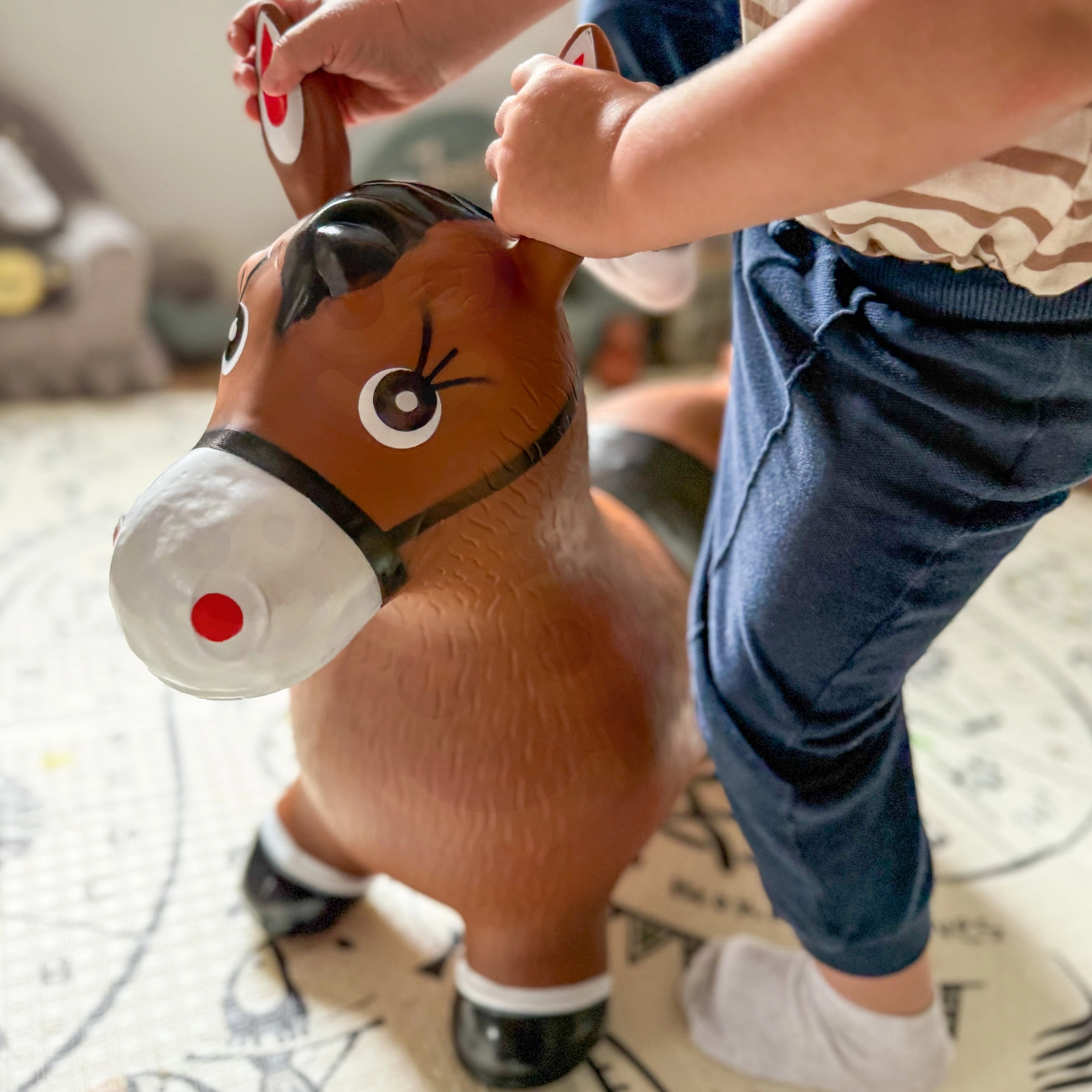 Skákací koník Woopie je ideálny parťák na aktívne hranie doma aj v herni. Deti sa môžu bezpečne odrážať, poskakovať a trénovať stabilitu vďaka uchopiteľným ušiam a širokým nohám koníka. Odolný, netoxický materiál PVC sa ľahko čistí a vydrží každodenné detské šantenie.