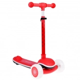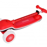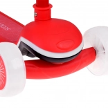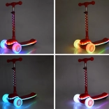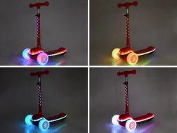 Kolobežka je navrhnutá pre prvé jazdy a rozvoj rovnováhy. Dvojité predné kolieska a široká platforma zvyšujú stabilitu, zatiaľ čo výškovo nastaviteľné riadidlá sa prispôsobia rastu dieťaťa. Farebné LED diódy v kolesách a ráme rozžiaria každú vychádzku – s možnosťou voľby až 20 svetelných režimov a 4 hudobných módov.