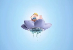 Kvet pláva na vode a jeho priehľadný pupok sa naplní vodou. S efektom dažďa, víriacim vílim prachom a okienkom na sledovanie dna vane.