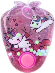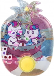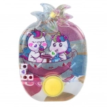 Táto vodná hra s motívom čarovných jednorožcov je klasická hračka, ktorá už mnoho rokov prináša radosť deťom rôzneho veku. Vďaka kompaktným rozmerom a jednoduchému mechanizmu je ideálna na cesty, do školy alebo na prechádzku. Hra spočíva v stlačení tlačidla, ktoré uvedie do pohybu farebné krúžky alebo guľôčky vo vnútri priesvitnej nádobky plnej tekutiny. Cieľom je umiestniť tieto prvky na kolíky alebo do určených miest.