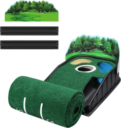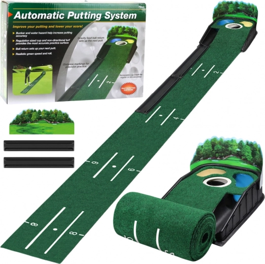 V balení sú aj bočné zábrany, ktoré zabraňujú vypadávaniu loptičiek, a realistická grafika s motívom golfového ihriska. Výrobok je vyrobený z kvalitného syntetického materiálu, ktorý napodobňuje skutočný trávnikový povrch a zaisťuje správny odpor pri pohybe loptičky.