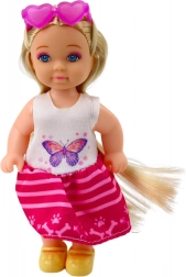 Tento rozkošný set prenesie deti do sveta starostlivej starostlivosti a hravej zábavy s domácimi miláčikmi. Bábika o výške 12 cm je oblečená v pestrých šatách: biele tričko s motýľou potlačou, ružovú sukňu s motívom labiek a žlté topánky. Bábika má na hlave ružové okuliare v tvare srdiečok, ktoré jej dodávajú výrazný charakter.