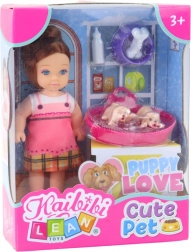 Mini bábika s dvoma šteniatkami je roztomilá sada, ktorá deti pozýva do sveta starostlivosti o zvieratká, zábavy a starania sa o nich. Hlavnou postavou je bábika vysoká 12 cm, oblečená v ružových šatách s módnym vzorom kockovanej sukne.